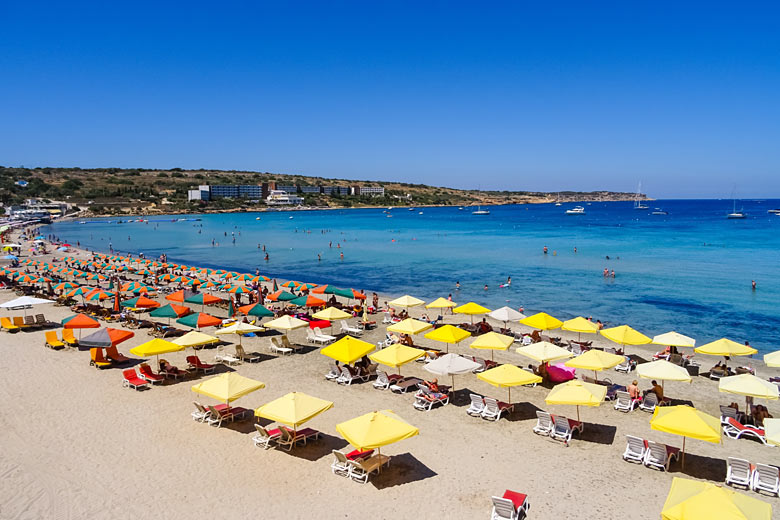 Golden Bay is the most well-known beach in Malta as it is arguably the most beautiful. Found on the northwest coast, it is one of the few sandy bays and boasts an arc of amber sand that shelves gently into the dark-blue Mediterranean.